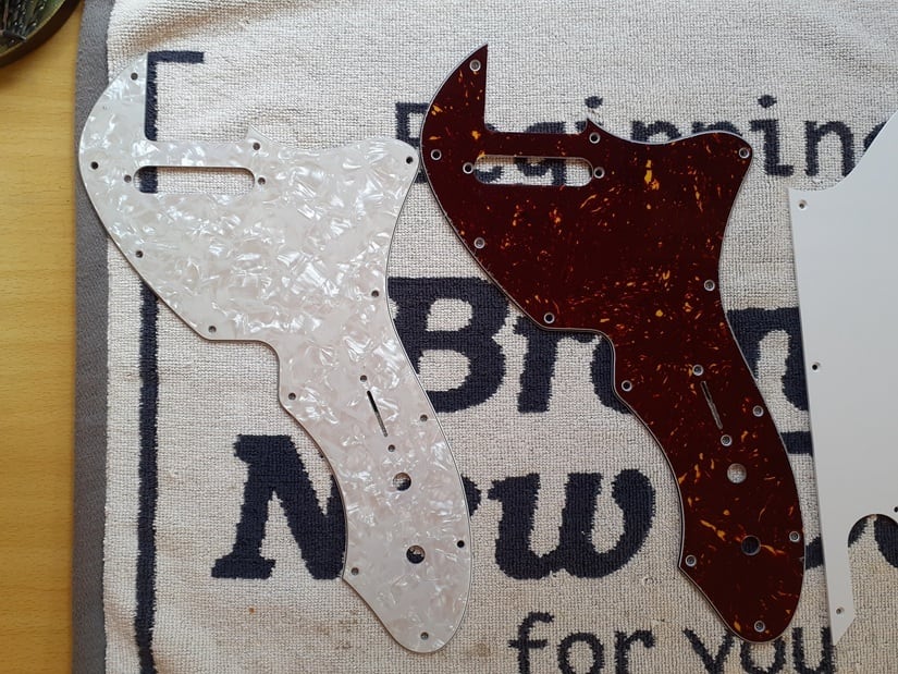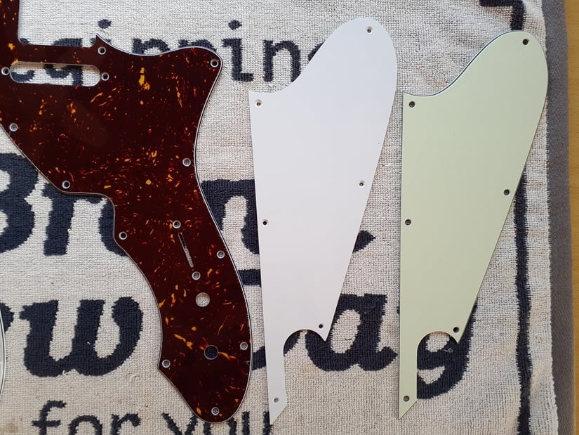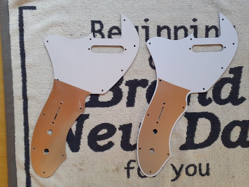 お客様から送付されたピックガードをテンプレートとし、素材・色違いのコピーを製作します。